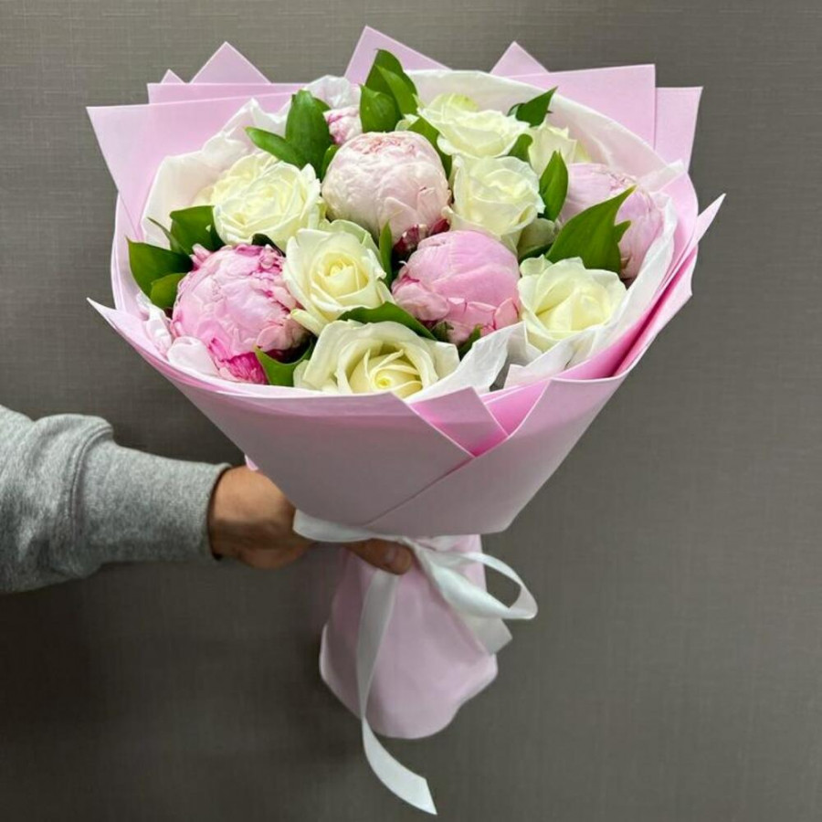 На фото букет «трепетное чувство». В составе: пион 5 шт, роза 9 шт, фоамиран 1 шт, атласная лента 1 шт, . Все цветы свежие и ароматные, букет красиво оформлен и отлично подходит для подарка. Доступна доставка цветов или самовывоз.